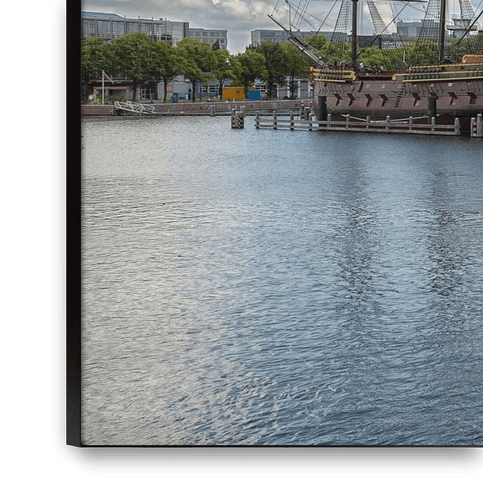 Das Schiff links im Bild ist ein farbenfrohes Museum auf dem Nachbau eines VOC-Schiffs von 1749 mit historischen Ausstellungen und Kunst und heißt Amsterdam.