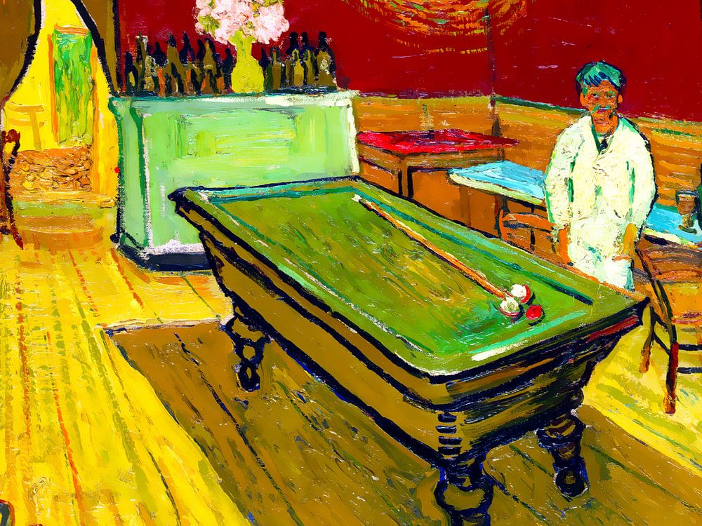 Een exacte afbeelding van het originele schilderij het nachtcafé van Vincent van Gogh uit 1888.