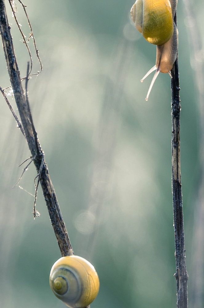 Porträt von zwei Hausschnecken, die jeweils auf einem Ast krabbeln. Das Foto ist in sanften Pastelltönen bearbeitet.