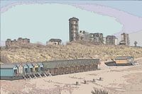Die Skyline von Vlissingen von den Dünen aus gesehen, im Vordergrund der Strand von Nolle mit den Wohnheimen.