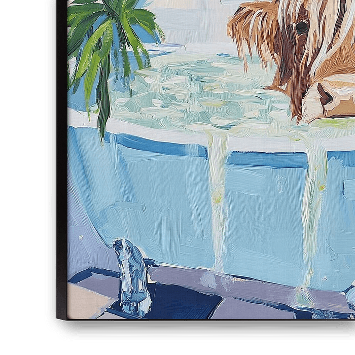 Eine Highland Cow in der Badewanne fasziniert durch ihren überraschenden Kontrast zwischen wilder Natur und alltäglichem Komfort. Diese skurrile Kombination inspiriert dazu, Konventionen zu hinterfragen und neue Wege des Denkens zu erkunden. Sie zeigt, wie Gegensätze sich ergänzen können und Humor eine Verbindung zwischen Welten schaffen kann. Das Bild lädt ein, das Leben mit Leichtigkeit und Fantasie zu betrachten. Solch ein Szenario bringt Freude und Kreativität in den Alltag.