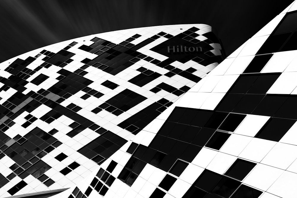 Hilton Hotel, Flughafen Schiphol, Amsterdam in Schwarz-Weiß-Kunst