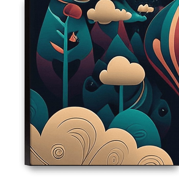 Dieses fesselnde Bild zeigt eine skurrile, abstrakte Szene mit einer surrealen, traumähnlichen Atmosphäre. Dominiert von satten Teal-, Orange- und Goldtönen, zeigt das Kunstwerk wirbelnde Wolken, abstrakte Bäume und himmlische Muster. In der Mitte schwebt ein alter Heißluftballon mit orangefarbenen und blaugrünen Streifen sanft zwischen…