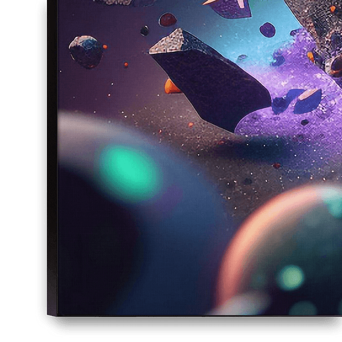 Dieses dynamische kosmische Kunstwerk zeigt große schwebende Felsen und kantige geometrische Formen, die im Raum schweben. Helle, leuchtende Elemente und lebhafte Farben - von elektrischem Blau bis zu feurigem Orange - verleihen der Szene Energie und ein Gefühl von Bewegung. Das Zusammenspiel von abstrakten Formen und räumlicher Tiefe…