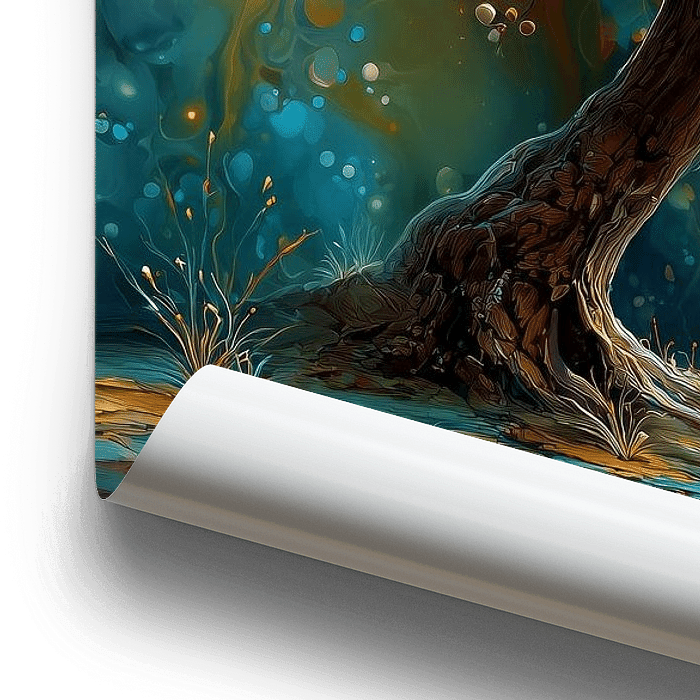 Dieses Fantasiegemälde zeigt eine bezaubernde Szene mit einem anmutigen Blütenbaum, der sich elegant über ein schimmerndes Gewässer beugt. Seine Äste sind reich mit weißen Blüten geschmückt, die von innen heraus zu leuchten scheinen und in ein magisches Licht aus Gold, Türkis und Tiefblau getaucht sind. Der Hintergrund scheint sich wie…