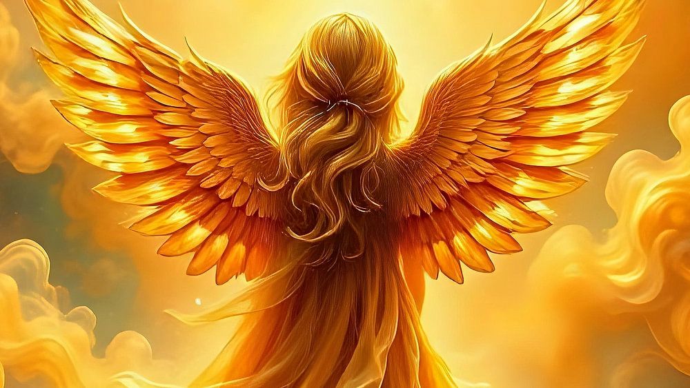 Das Hintergrundbild zeigt einen majestätischen Engel, der sanft inmitten von weichen, fließenden Wolken oder zartem Rauch schwebt. Die Figur des Engels strahlt eine Aura von Ruhe und Frieden aus, während sie in einer anmutigen Pose dargestellt ist. Die Wolken um ihn herum wirken fast ätherisch und schaffen eine traumhafte Atmosphäre, die den Betrachter in eine andere Welt entführt.