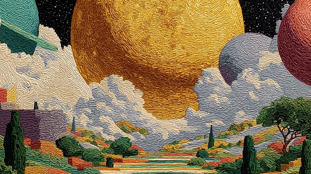 Über diesem gemalten Eden schwebt ein himmlisches Ballett: riesige strukturierte Planeten, die mit wirbelnden Pastellstrichen dargestellt sind, schweben unmöglich nahe am Horizont. Eine riesige goldene Kugel beherrscht den Himmel und leuchtet wie eine Sonne, die aus altem Bernstein geschnitzt wurde. Um sie herum treiben blaugrüne, lavendelfarbene und rosafarbene Welten, jede einzelne mit taktilen, hypnotischen Kreisbewegungen gemalt, als ob sie von einem langsamen kosmischen Herzschlag beseelt wäre.