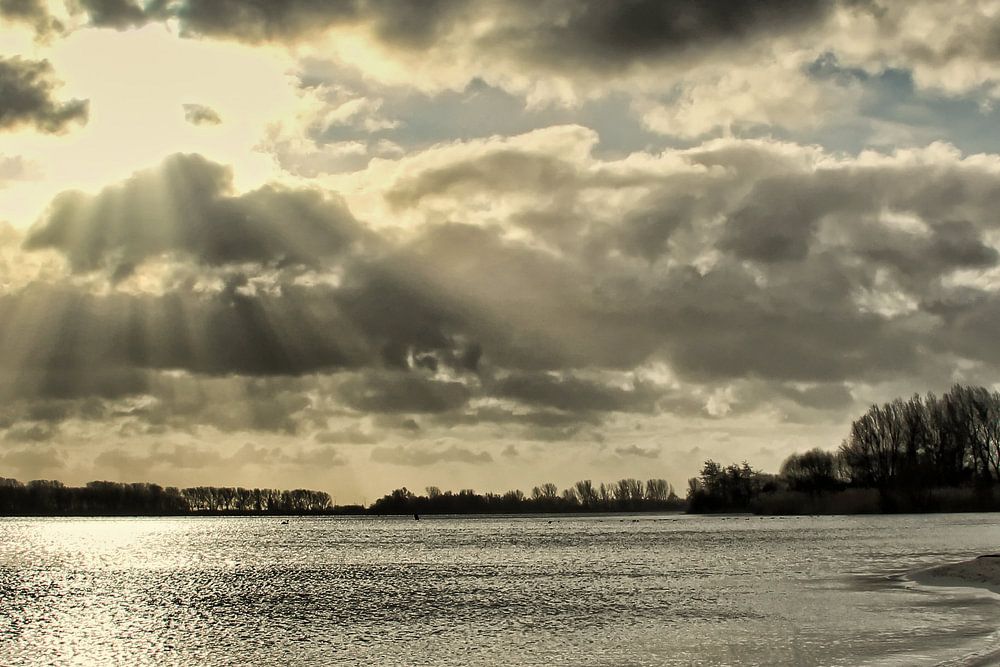 Bedrohliche Wolken Himmel über dem Vlietlanden in Voorschoten , Niederlande. Aber ... hinter den Wolken scheint die Sonne, hier sind die Strahlen der Sonne deutlich sichtbar.