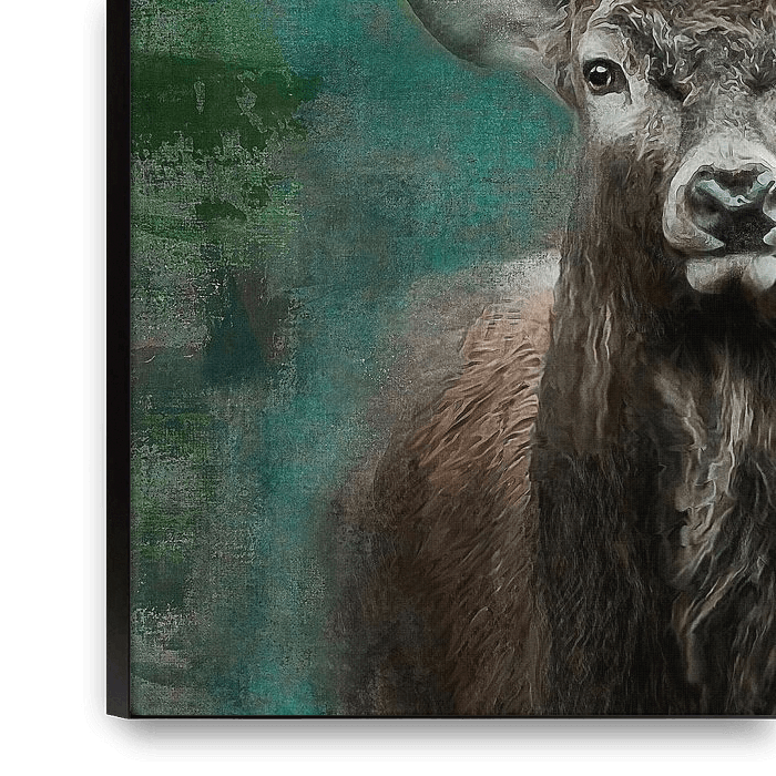 Ein Hirsch Portrait (Reproduktion). Kraftvoll, ruhig und absolut zeitlos – dieses grüne Hirsch Wandbild verbindet moderne Abstraktion mit der majestätischen Präsenz eines klassischen Symbols. Perfekt geeignet für dein Wohnzimmer.