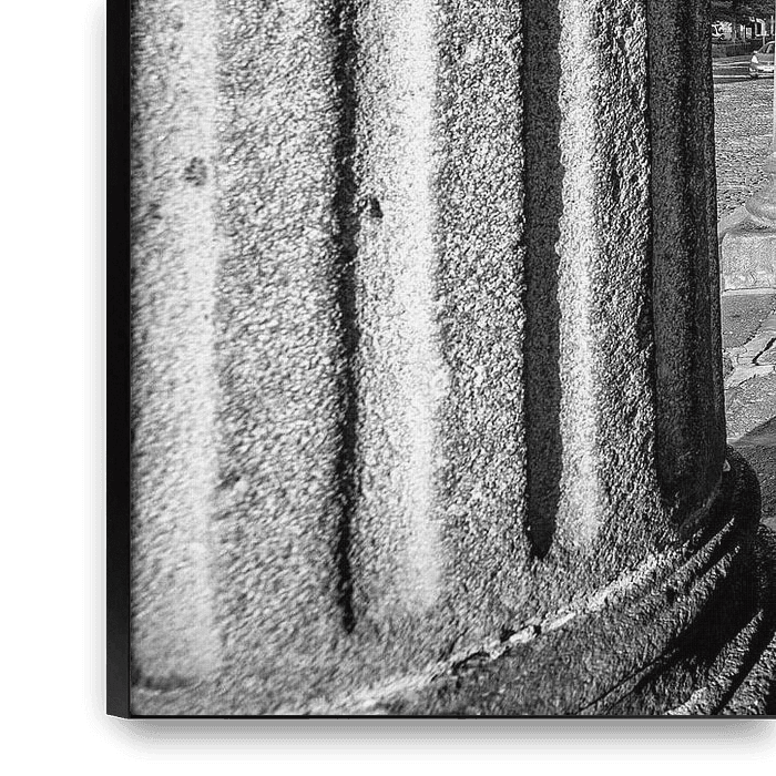 Schwarz-Weiß-Architekturfotografie einer beeindruckenden kolonialen Arkade in Antigua, Guatemala, einem Meisterwerk der spanischen Kolonialarchitektur. Der elegante Bogengang mit seiner Reihe klassischer Säulen schafft eine hypnotische Perspektive, die den Blick in die Ferne zieht, wo Figuren wie Silhouetten durch das Sonnenlicht…