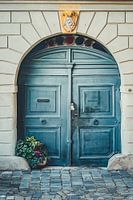 Dieser Fotodruck zeigt eine schöne, historische Tür im Herzen von Brünn, Tschechische Republik. Das robuste blaue Holz kontrastiert wunderschön mit der cremefarbenen Fassade und den bunten Steinen des Gehwegs. Über der Tür befindet sich ein verziertes Familienwappen, das von Buntglasdetails umgeben ist und diesem zeitlosen Eingang einen…