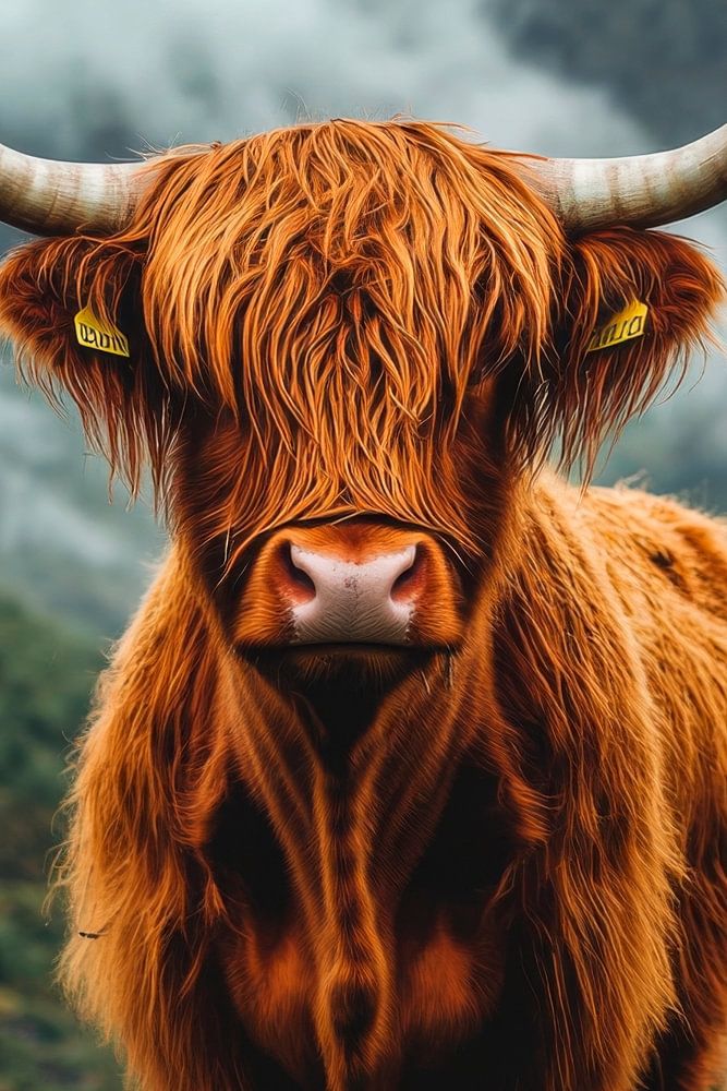 Inmitten einer dramatischen, nebelverhangenen Landschaft steht ein majestätisches Hochlandrind. Mit seinem langen, zotteligen, rötlichen Fell und den imposanten, geschwungenen Hörnern strahlt es eine urige Stärke aus. Die sanften, neugierigen Augen scheinen Geschichten vergangener Zeiten zu erzählen, während der Wind durch die grüne Umgebung weht und das Bild lebendig werden lässt.