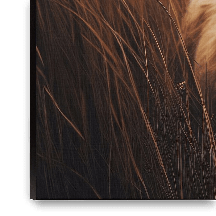 Dies ist ein digitales Bild eines Hochlandrindes/einer Hochlandkuh im hohen Gras. Das Foto hat einen goldenen Schimmer. Das Tier ist in Großaufnahme zu sehen.