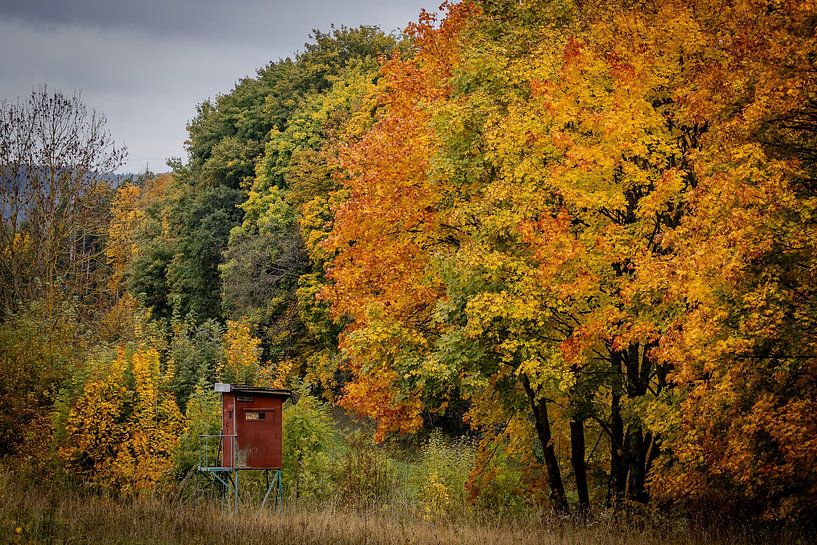 Dieses Foto entstand in Bad Lauterberg im Harz und zeigt einen roten Hochstand der von herbstlich gefärbten Bäume umgeben ist.