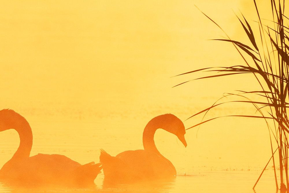 Ein Paar Höckerschwäne, Cygnus olor, schwimmt bei den Groene Jonker, Nieuwkoop in Südholland. Schöne orangefarbene Hintergrundbeleuchtung.