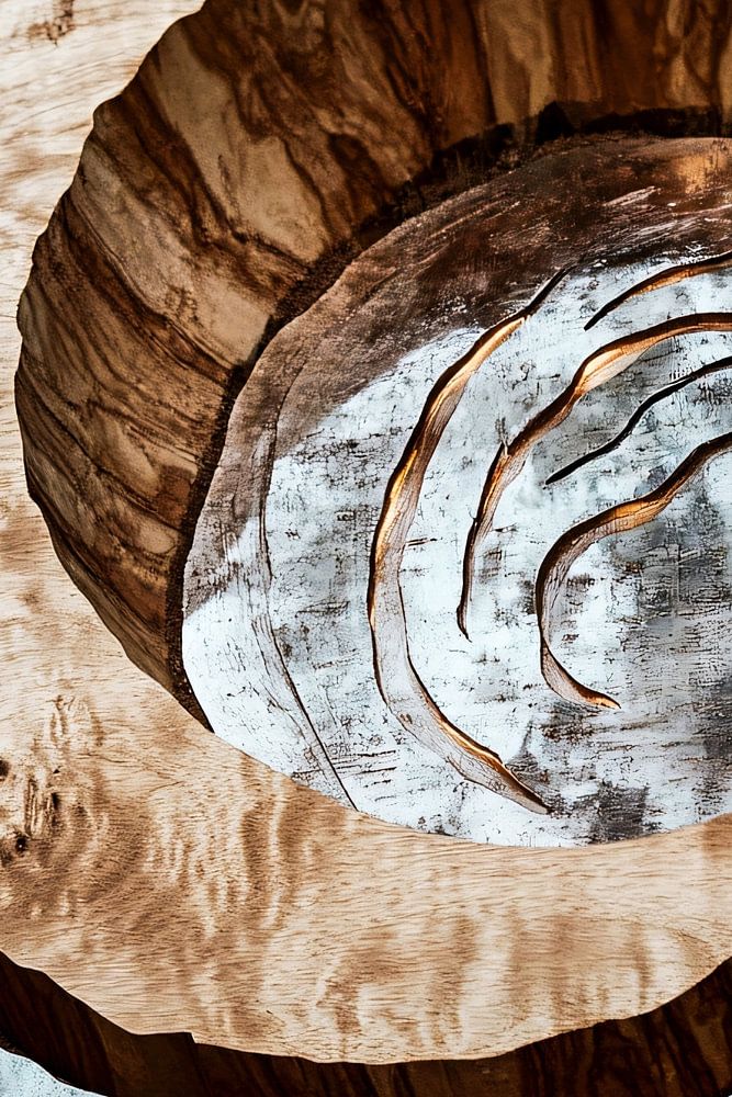 Dieses einzigartige Design zeigt einen wunderschön gestalteten Holzmond, der von organischen Linien und metallischen Akzenten eingerahmt wird. Das natürliche Holzmuster und die glänzende Metalltextur erzeugen ein harmonisches Spiel aus Kontrast und Bewegung. Perfekt als dekoratives Kunstwerk für ein minimalistisches Interieur oder um eine natürliche, ruhige Atmosphäre in einem Raum wie einem Schlafzimmer oder Büro zu schaffen. Durch die Kombination von Handwerkskunst und künstlerischem Ausdruck spricht das Design sowohl Liebhaber moderner als auch zeitloser Stile an.
