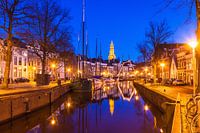 Uitzicht op de monumentale panden aan het Hoge der A in de binnenstad van Groningen tijdens de avondschemering in het blauwe uur. Op de achtergrond is de kerktoren van de Der Aa-kerk nog zichtbaar. De foto is genomen vanaf de Vissersbrug.