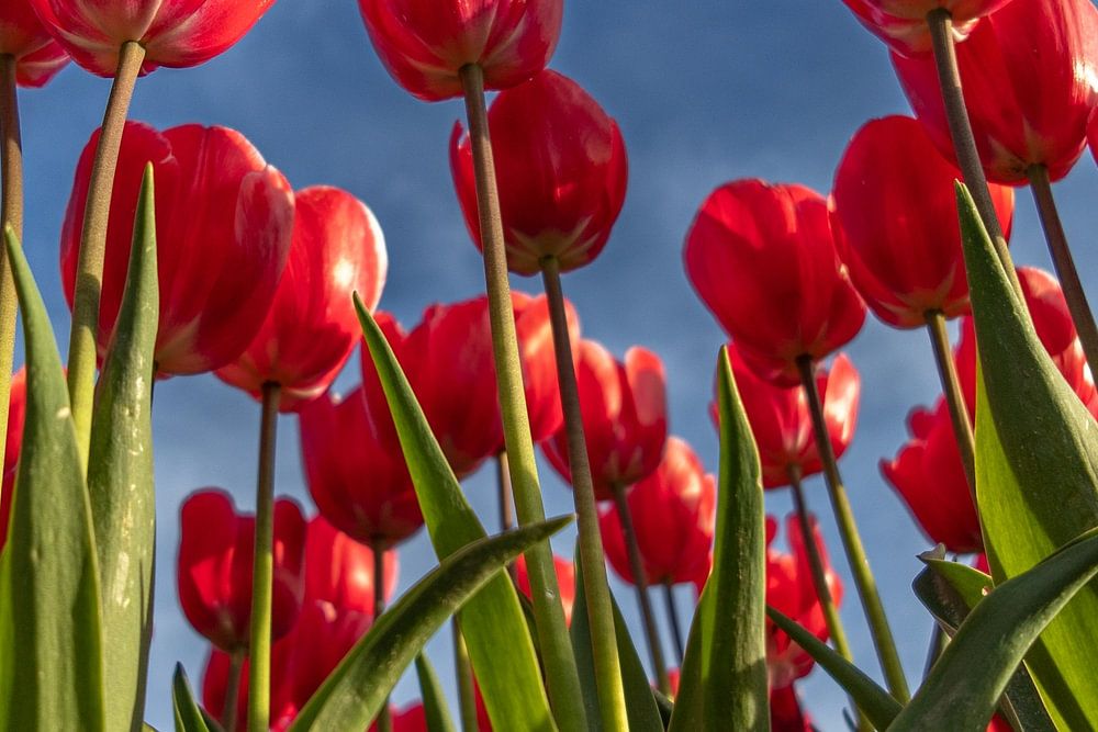 Wie holländisch soll es denn sein? Dieses Bild zeigt leuchtend rote, rosafarbene und orangefarbene Tulpen, die von unten fotografiert wurden, während über ihnen ein strahlend blauer Himmel liegt. Die Stängel ragen hoch über das Objektiv hinaus, sodass die Blumen fast monumental wirken. Durch die Perspektive stehen Sie als Betrachter wirklich inmitten der Tulpen, als wären Sie ein Teil des Feldes. Hier zeigt sich Holland von seiner farbenfrohesten und ikonischsten Seite. Die leuchtenden Farben, die frische Luft und die typisch holländische Offenheit machen dieses Bild perfekt für alle, die Blumen, den Frühling und unsere Polderlandschaft lieben. Für mich als Fotografin ist es eine Ode an unser Land, gesehen aus einer spielerischen und überraschenden Perspektive. Ein fröhliches Bild voller Leben und Einfachheit.