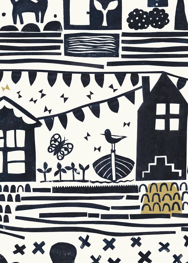 Alle diese Elemente sind aus handbedrucktem Papier ausgeschnitten. Dies verleiht dem Werk ein authentisches, unvollkommenes Aussehen.