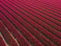 Tauchen Sie ein in ein Meer von leuchtenden Farben mit dieser atemberaubenden Drohnenaufnahme eines niederländischen rosa Tulpenfeldes im bezaubernden Nordostpolder! Von oben betrachtet sieht das Feld wie ein malerisches Meisterwerk aus, in dem sich Reihen um Reihen zartrosa Tulpen bis zum Horizont erstrecken. Der klare Himmel und die…