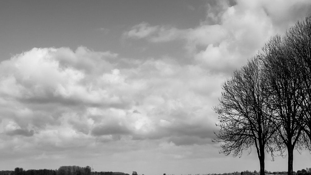 Foto genomen nabij het Egboetswater nabij Medemblik. Een tulpenveld afgedrukt in zwart-wit. De bomen benadrukken de diepte van de foto.