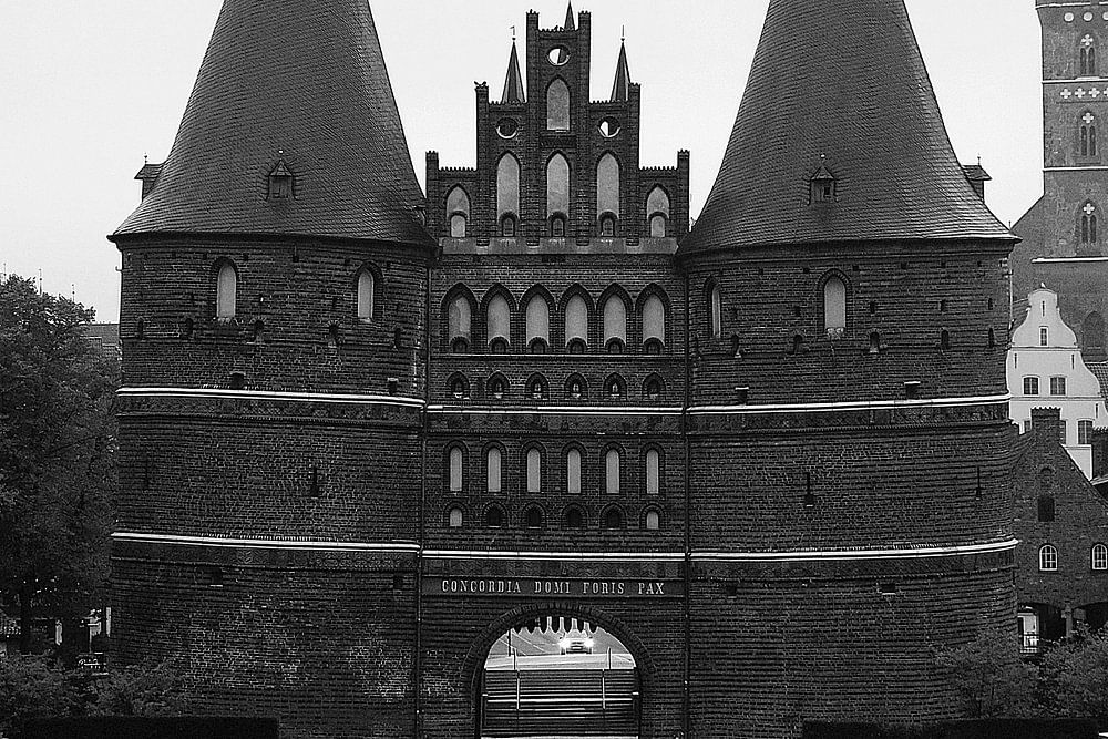 Schwarz weiß Bild vom Holstentor in Lübeck