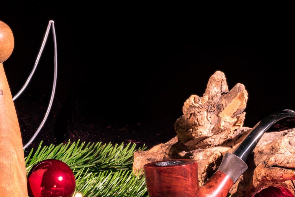 Weihnacht, Wein, Glas, Pfeife, Engel, Holzfigur, Christbaum Kugeln, Tannenzweig, Kerze, Teelicht, rot, grün, braun, schwarz, Gemütlich, ruhig, festlich, Nadeln, kerzenlicht, Advent, Religion, Christentum, Dekoration, Raucher,