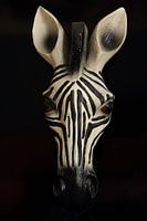 Kunstwerk eines in Holz geschnitzten Zebrakopfes mit schwarzem Hintergrund. Schwarze und weiße Linien.