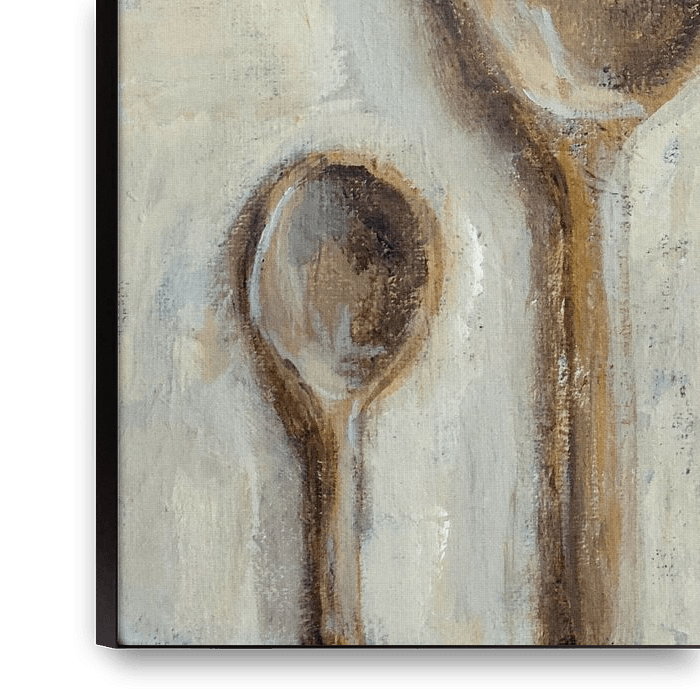 Abstraktes Gemälde mit vier Holzkellen. Schöne Farben mit Sand, Beige, Braun und Weiß. Die Bemalung der Holzlöffel passt gut in eine Küche oder ein Restaurant.