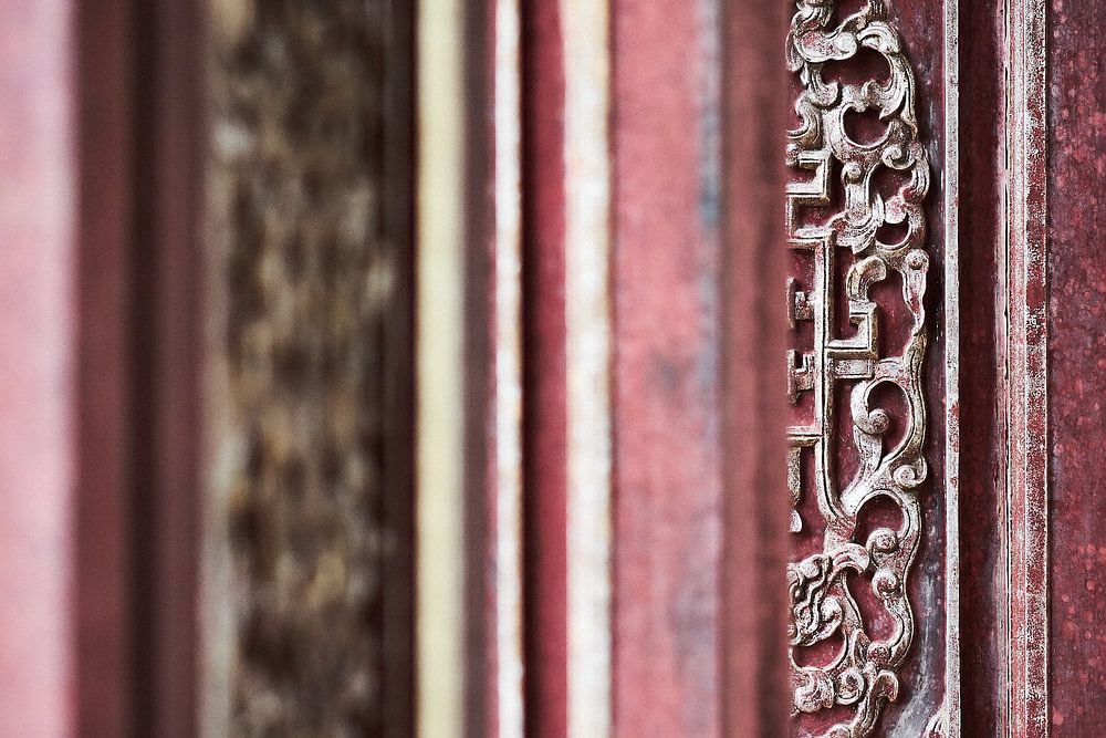 Holzschnitzereien an Türen eines vietnamesischen Tempels