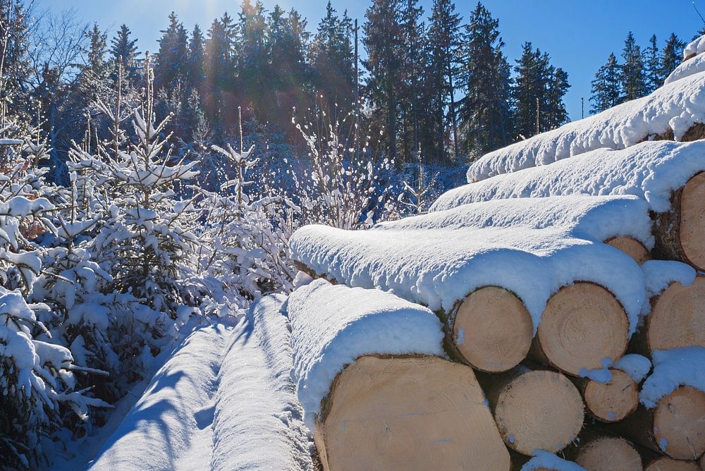 Holzlager im Wald, verschneite Baumstämme und strahlend blauer Himmel mit Sonnenschein