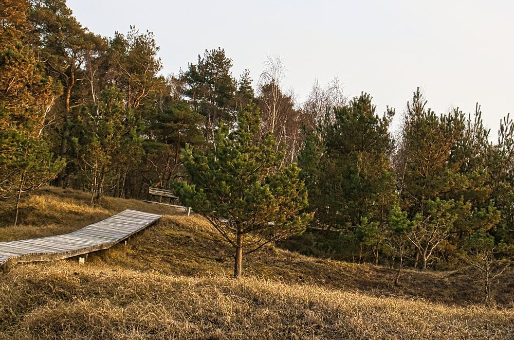 Holzweg durch die Dünen an der Ostsee in Zingst auf dem Darß. Naturschutzgebiet am Meer.