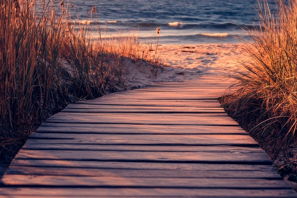 Ein sanfter Holzsteg schlängelt sich durch sanfte Gräser, die im warmen Licht der Abenddämmerung leuchten. Der Horizont glitzert im Spiel der Wellen, während die Sonne langsam ins Meer gleitet. Eine einladende Ruhe umgibt diesen Pfad, der die Seele zu neuen Ufern führt.