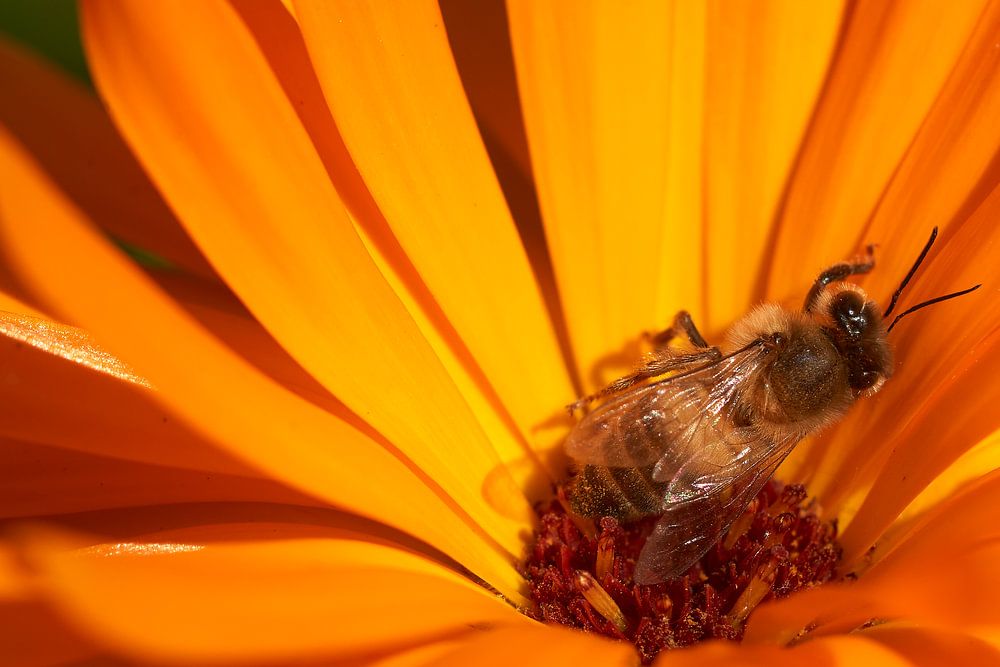 Eine junge Honigbiene versucht, aus einer Ringelblume zu klettern. Da die Blütenblätter nach oben ragten, war dies ein ziemlicher Aufstieg. So hatte ich etwas mehr Zeit zum Fotografieren. Durch meine Arbeit als Bildredakteurin für die Zeitschrift Bijenhouden beschäftige ich mich sehr intensiv mit Bienen im Allgemeinen. Dieses Foto ist eher ein "Glückstreffer". Das Foto wurde mit einer Leica Messsucherkamera mit elektronischem Sucher und Balgengerät aufgenommen. So konnte ich sehr nahe herankommen. Dies war jedoch die einzige Aufnahme, die völlig scharf war. Die Farbe der Ringelblume macht sie zu einem sehr sommerlichen Foto, das jedes Interieur verschönern kann und wird.