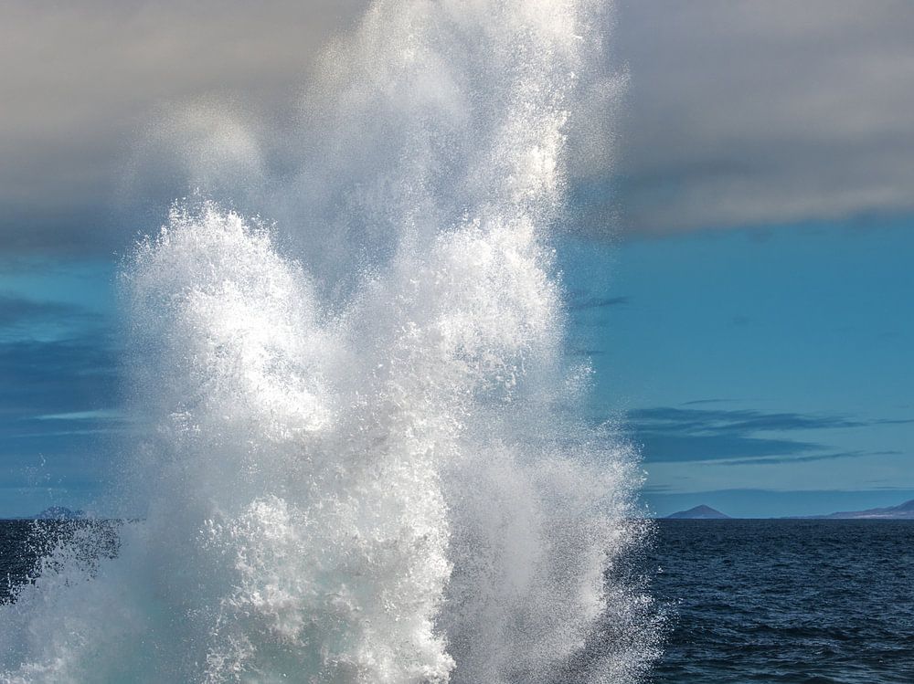 Hoog opspattende golf aan de noordkust van het Canarische eiland Lanzarote bij Tenesar met Montana Clara op de achtergrond aan de horizon.