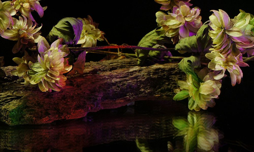 Getrocknete Hopfendolden auf einem Stück Regal drapiert, mit verschiedenen Lichtfarben beleuchtet und das Ganze auf einer verspiegelten Fläche platziert, die Tiefe und Verspieltheit erzeugt
