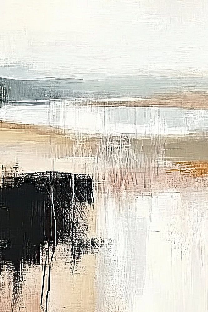 Horizon | Echoes of Tranquil Past - Dieses abstrakte Landschaftsgemälde bietet eine heitere Interpretation eines Horizonts, die neutrale und erdige Töne mit kräftigen, schwarzen Akzenten verbindet, die Tiefe und Emotionen suggerieren.
