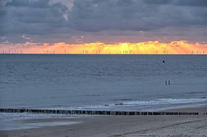 Sonnenuntergang am Strand von Dishoek in Zeeland. Es sieht aus, als würde das Meer brennen. Die Windmühlen, die im Meer stehen, sind gut zu sehen.
