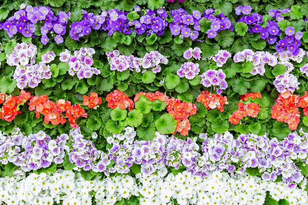 Horizontale Reihen von blühende Blumen in verschiedenen Farben. Zeilen von Blumen mit Farben wie rosa, weiß, lila, rot und blau. Blumen die in der Frühjahrs Saison blühen.