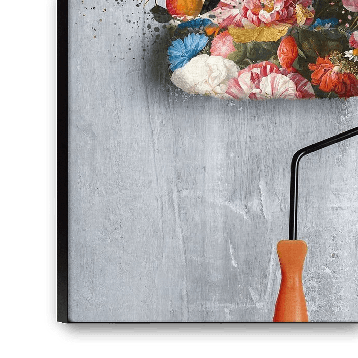 Ein Wandfarbroller zaubert ein Blumenstillleben auf eine Betonwand.