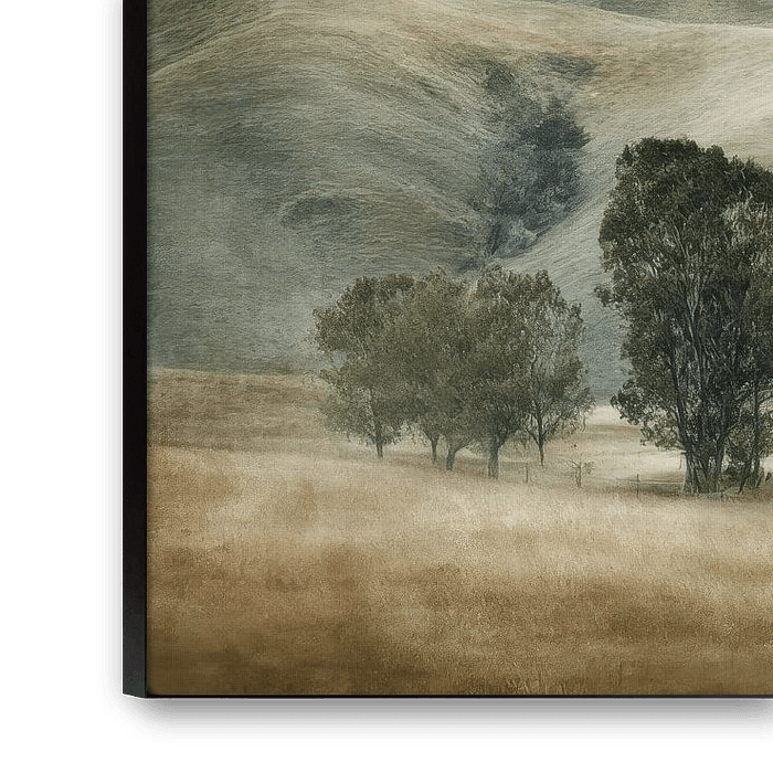 Diese grüne, graue Kunstkomposition mit sanft geschwungenen Hügeln und einsamen Bäumen wirkt ruhig und elegant und bringt sanfte natürliche Schönheit in Ihr Interieur. Das Bild strahlt Gelassenheit aus und verleiht dem Raum ein zeitloses, künstlerisches Gefühl.