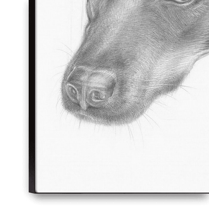 Realistische und detaillierte Bleistiftzeichnung einer Hündin. Porträt von Diana in schwarz-weiß.