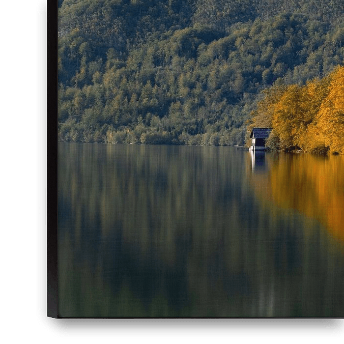 Bestelle das Foto Hütte am See in Bohinj von Benjamien t'Kindt als Reproduktion auf Leinwand, Alu-Dibond, als Poster, Fototapete oder Acrylglasbild.