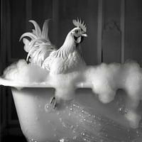 Dieses originelle Badezimmer Bild ist ein echter Blickfang! Mit einem lachenden Hahn, der die Ruhe in seiner Badewanne genießt, bringt es Charme und Witz in jedes moderne Badezimmer. Die schwarz-weiße Fotografie unterstreicht die zeitlose Eleganz, während die Szene selbst unter den lustigen Badezimmer Bildern eine Sonderstellung…