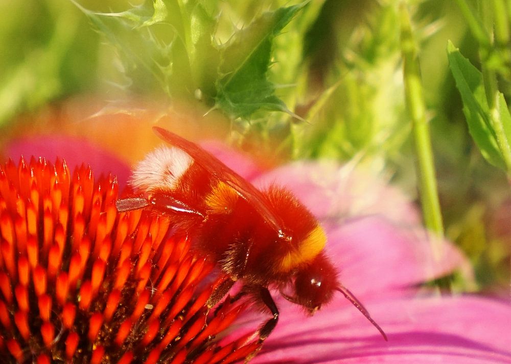 Die Blumen und Bienen in Doppelbelichtung erzeugen einen weichen, verträumten Effekt.