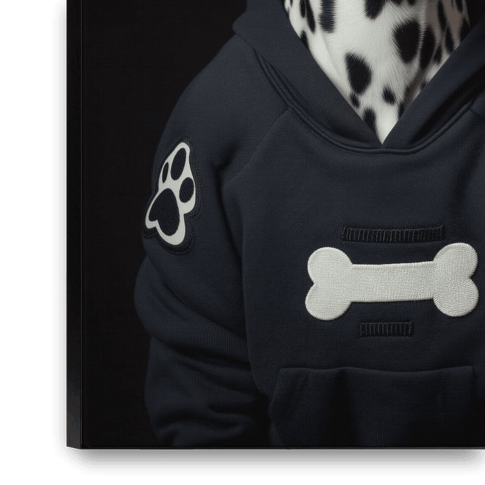 Bestelle dieses Popart-Wandbild Hund - Dalmatiner - mit schwarzem Pullover von Marianne Ottemann - OTTI als Reproduktion auf Leinwand, Alu-Dibond, als Poster, Fototapete oder Acrylglasbild.