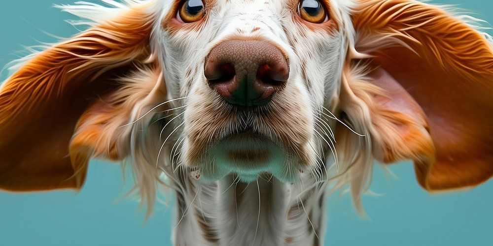 Ein charmanter Hund mit langen, abstehenden Ohren, die von einer leichten Bewegung oder einem Windstoß aufgefächert werden. Sein treuer und neugieriger Blick wird durch den klaren, türkisfarbenen Hintergrund hervorgehoben. Das Bild kombiniert Humor und Niedlichkeit und fängt die verspielte Natur des Tieres perfekt ein.