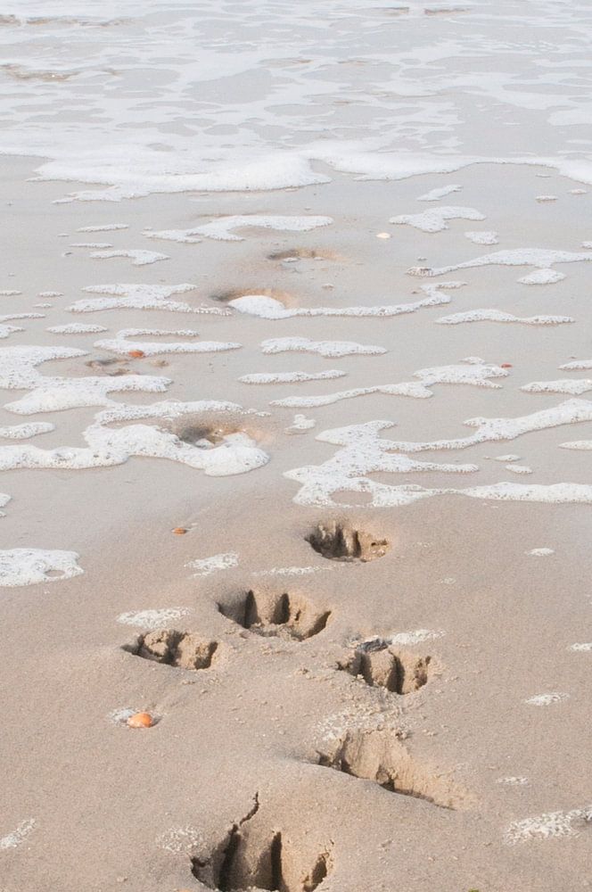 Spur von Hundebeinabdrücken, die vom Sand den Strand hinunter ins Meerwasser führen.
