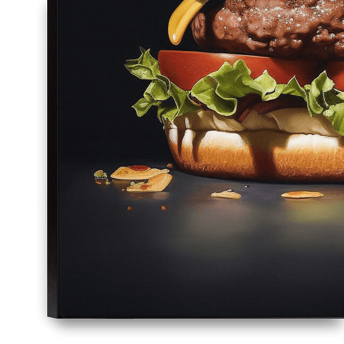 Ist es ein Foto? Oder doch ein Gemälde? Dieses atemberaubende Porträt im hyperrealistischen Stil fängt einen verlockenden Burger in seiner ganzen Köstlichkeit ein, mit einem dramatischen schwarzen Hintergrund, inspiriert von dem berühmten Künstler Tjalf Sparnaay. Das Meisterwerk erweckt die Textur, die Farben und die Details des Burgers…