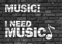 Graffiti in schwarz und weiß auf Mauerwerk. I need Music! Tolles Design für Musiker, Gitarristen, Bassisten oder Drummer.